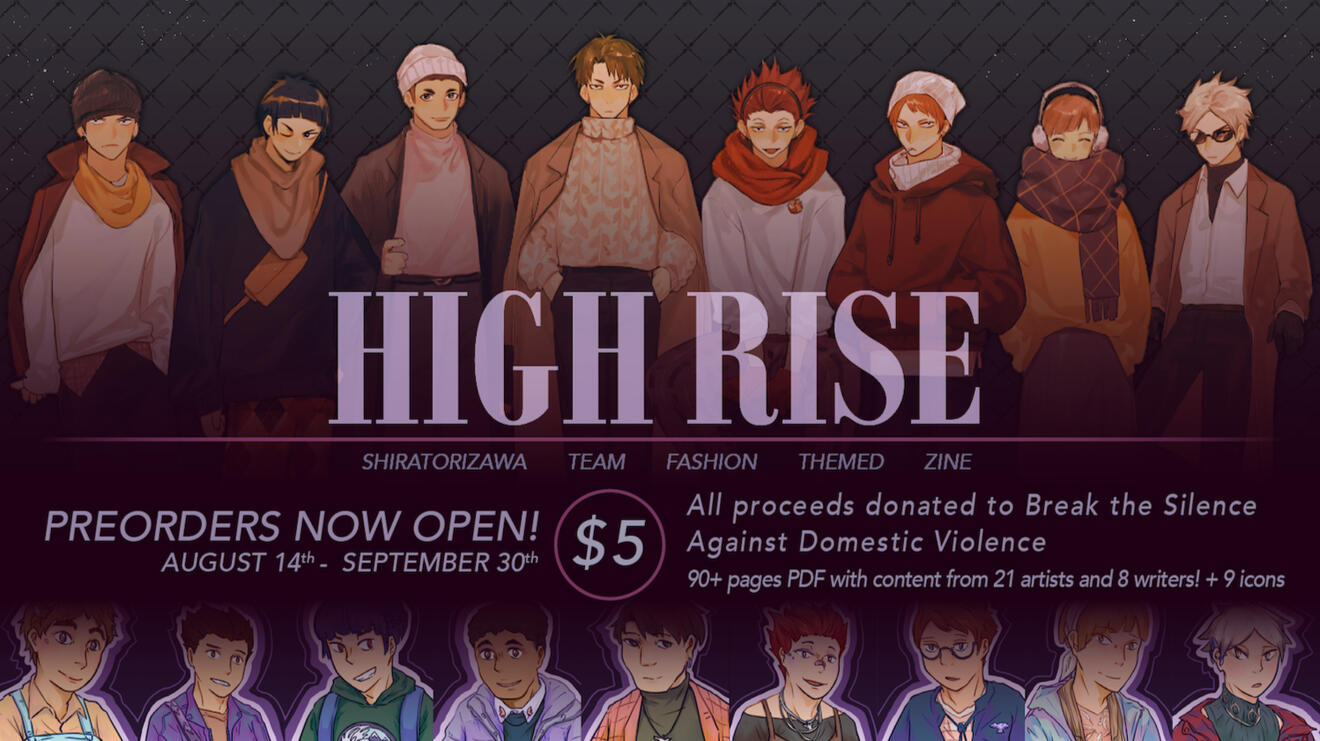 High Rise is a digital zine that will be released as a pdf for charity. All proceeds of the zine will be donated to Break the Silence Against Domestic Violence! The zine will feature various fashion styles and eras, revolving around the Shiratorizawa volleyball teammates. Other characters are welcome to be illustrated, but the main focus will be on the Shiratorizawa team members. The zine will feature both artists and writers.